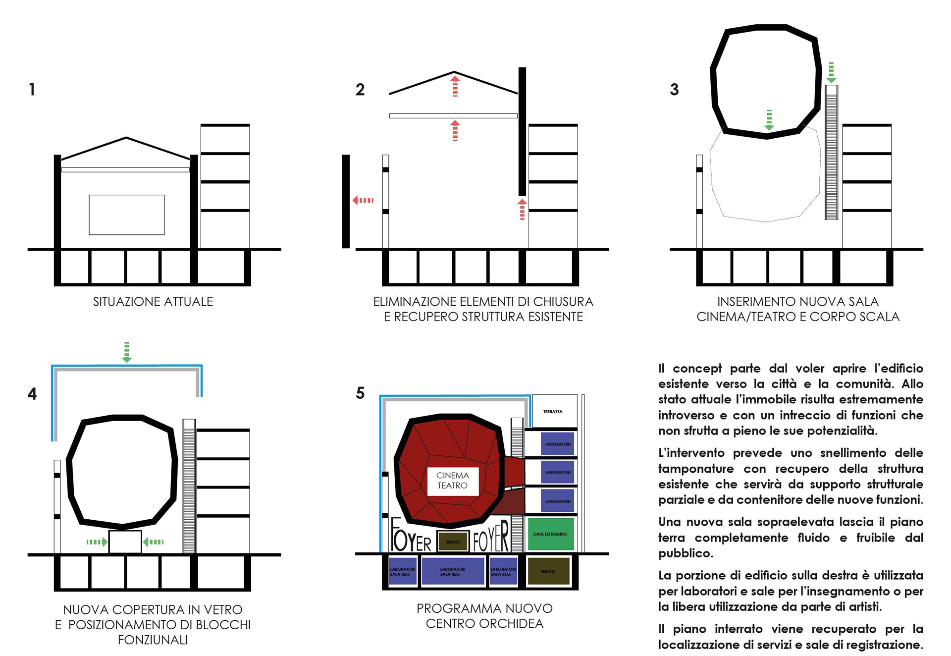 Urban regeneration of an abandoned cinema in Reggio Calabria, Italy. The concept starts from the idea to open the existing building towards the city and the community. At present the property is extremely introverted and with a mix of functions that does not fully highlights its potential. The intervention involves a streamlining of the facade recovering the existing structure which will serve as partial structural support and container for the new functions. A new raised room rise from the ground floor which become a foyer completely fluid and lived by people. The portion of the building on the right is used for laboratories and teaching rooms or for free use by artists and students of the new performing center. The basement is recovered for the location of services and recording rooms.